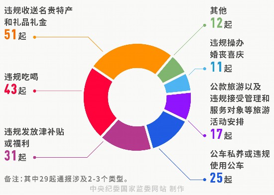 从具体问题类型看,违规吃喝、违规收受礼品礼金、违规发放津补贴、违规使用公车、违规操办婚宴、违规公款旅游等多种情形,都是节日期间容易发生的踩踏纪律红线的突出问题。其中,违规收送名贵特产和礼品礼金、违规吃喝问题分别为51起、43起,居于问题总数第一、第二,充分表明严查享乐主义、奢靡之风丝毫不能松懈。