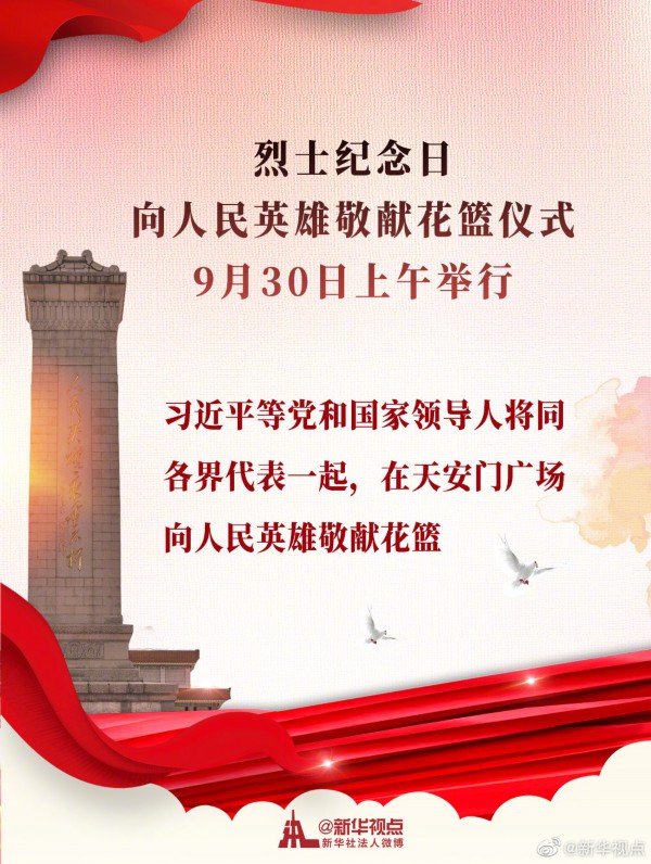 新华社北京9月28日电 9月30日是国家设立的烈士纪念日,当天上午,习近平等党和国家领导人将同各界代表一起,在天安门广场向人民英雄敬献花篮。