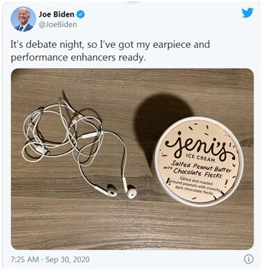 “今晚是辩论之夜,所以我准备好了耳机和‘兴奋剂’。”当地时间29日晚,拜登发推写道。推文所配照片中有一副耳机和一盒冰激凌。