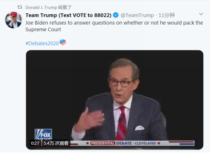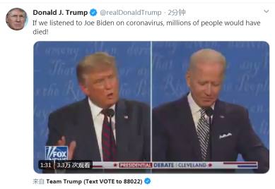 辩论场上的激烈交锋让人不禁发问:特朗普怎么还有时间同时发推?原来,这些推文的大部分都下附信息——“来自特朗普竞选团队”。