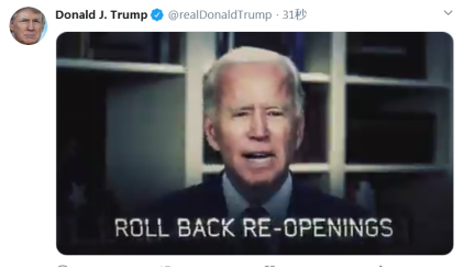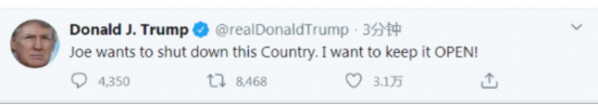 特朗普的推特每隔几秒或几分钟便发推一条,形式多为视频,且内容几乎同步直播辩论场上的交锋点,也无一例外全部将“枪口”对准拜登。其中的一条推文还写道:“乔(拜登)想要关闭这个国家。我想让它保持开放!”↓