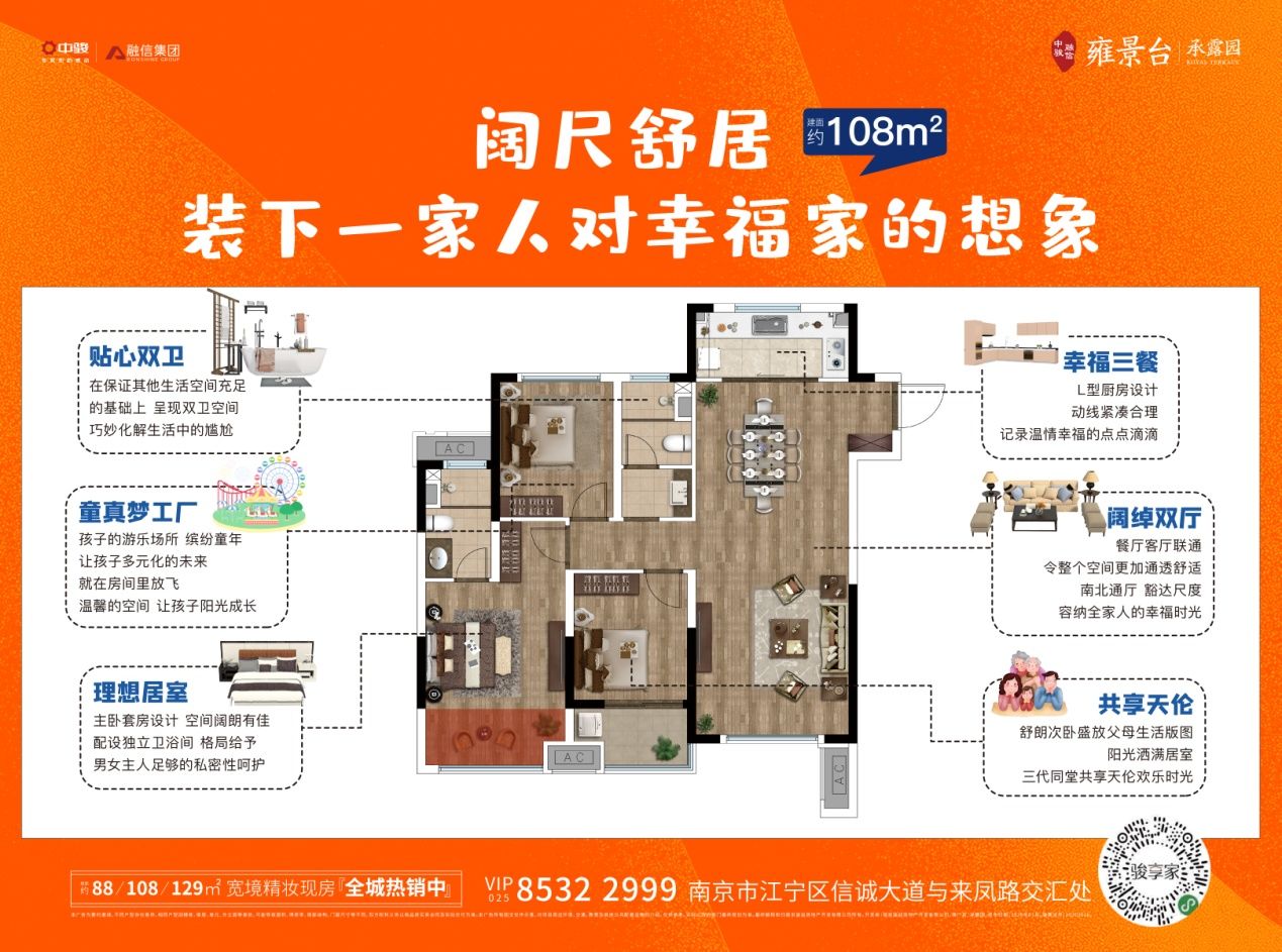 建面约88/108㎡观景楼王,既能满足日常,且能保证居家的舒适度和私密度,休憩娱乐,会晤亲友,从容有度,让生活的每一面都温暖明媚。老人尽享天伦,孩子乐玩童年,足够宽敞的生活空间,也能够容纳所有温柔和快乐,中骏融信承露园更宽绰的生活尺度,也让三代同堂成为现实,温柔刻画细节,让每一平米都充满温度。