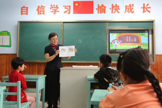 ▲盛淑琴用自创课件给孩子们上课