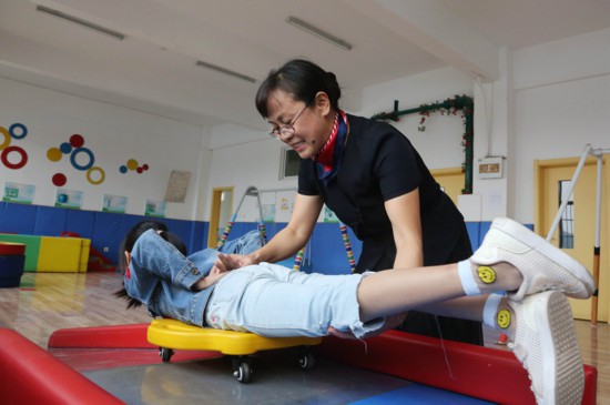 ▲盛淑琴带着孩子做康复训练