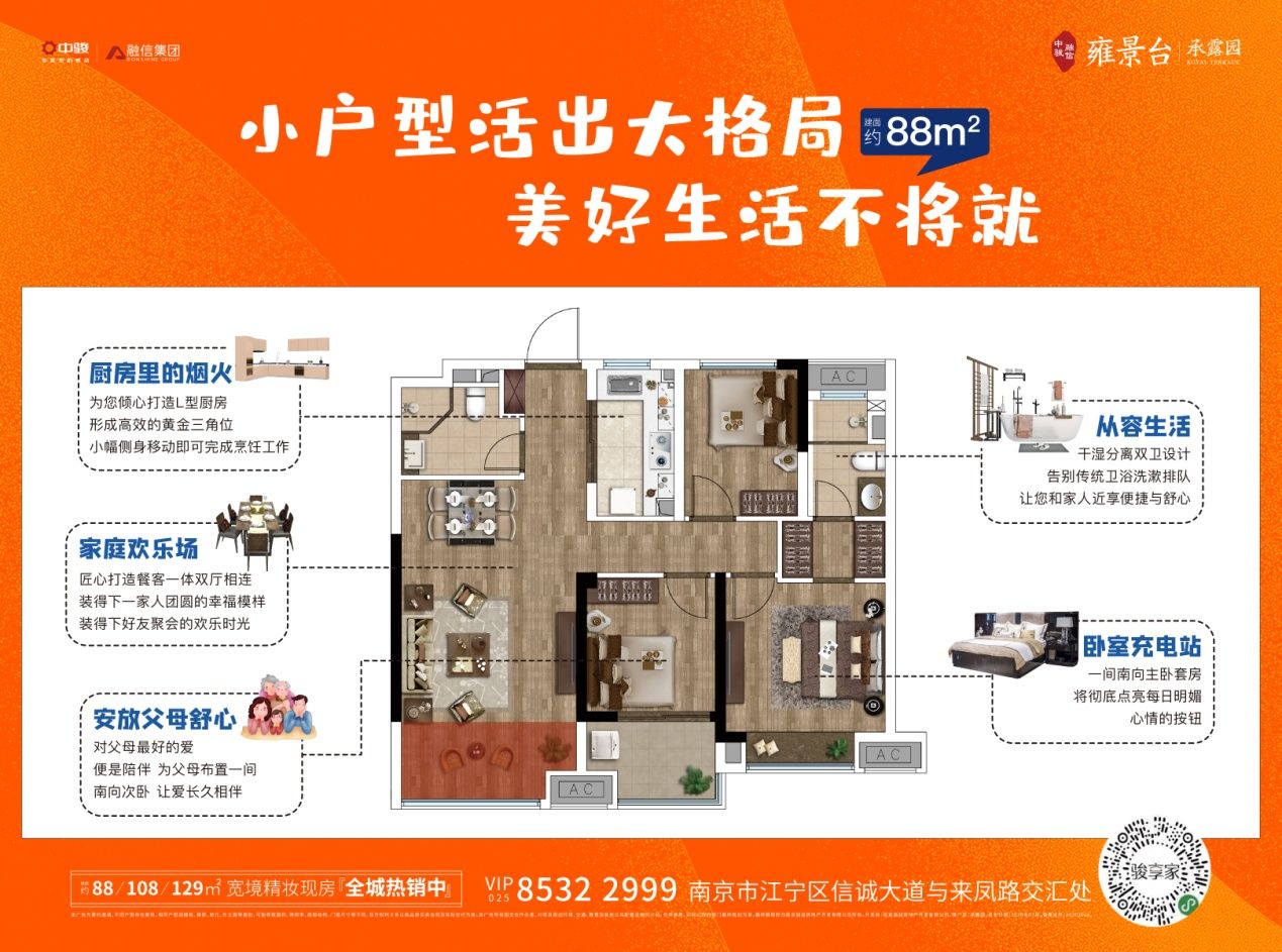 建面约88/108㎡观景楼王,既能满足日常,且能保证居家的舒适度和私密度,休憩娱乐,会晤亲友,从容有度,让生活的每一面都温暖明媚。老人尽享天伦,孩子乐玩童年,足够宽敞的生活空间,也能够容纳所有温柔和快乐,中骏融信承露园更宽绰的生活尺度,也让三代同堂成为现实,温柔刻画细节,让每一平米都充满温度。