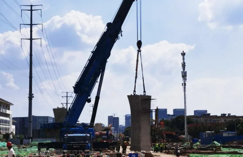 你见过“装配式立交桥”吗?就像搭积木那样。昨天上午8时18分,随着现场指挥的一声令下,300吨的大型吊车缓缓起吊,将一个重达90多吨的预制高架桥墩柱从卡车上吊起,缓缓升空、旋转,到达指定位置后,再缓缓下放,同时进行调整,墩柱基脚上的44个套筒,与地基承台上的44根竖立的钢筋完美碰接,吊装一次成功……这不仅预示着江平路二期非涉铁段预制墩柱进入吊装阶段,也预示着扬州快速路网建设将现首座“装配式立交桥”。