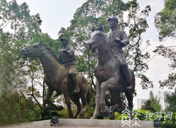 屹立在凤城河畔东进广场的陈毅、粟裕雕塑,两人身着新四军军服,头戴军帽,分别骑在并驾齐驱的马上,手牵缰绳,瞩目远眺。