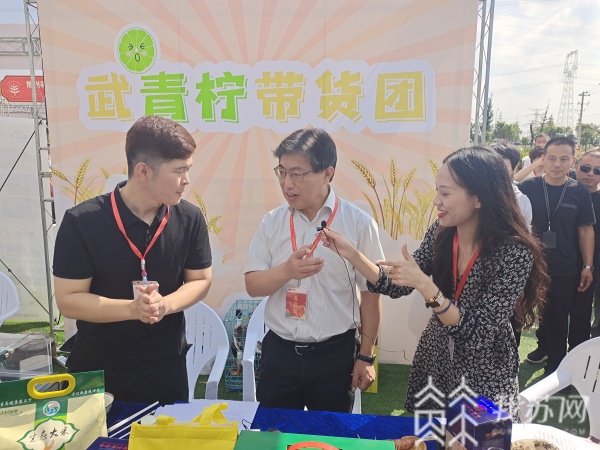 与往届不同,今年的丰收节现场不仅有农产品展销,还专门设置现场“直播间”带货,20多家名优农产品企业进行直播,促销助农。常州市委副书记蔡骏现场化身“带货官”,助力新康特色农产品销售,他一边品尝一边点评“很下饭”。