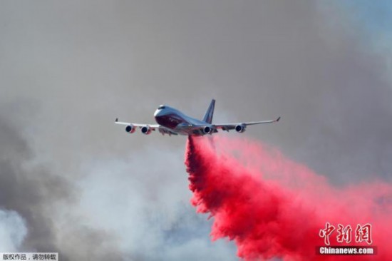 美国加州“玻璃大火”迅速蔓延。图为当地出动飞机撒红色阻燃剂灭火。