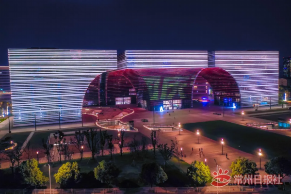 在文化广场新地标,宏大的建筑外立面和穹顶都渲染成红色的海洋,灯光组成的图案滚动播放“国庆节快乐”和“常州教我如何不想她”字样,营造出浓浓的节日气氛。