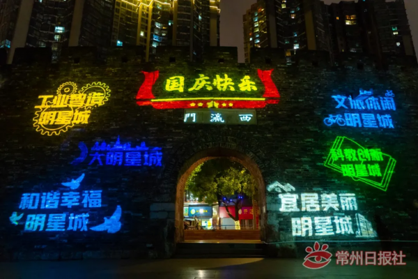 西瀛门城墙灯光秀以“国庆快乐、盛世中华”为核心元素,辅之象征中华民族和中国精神的国旗图案、长城、华表等图案,通过灯光投射在老城墙上,打造视觉盛宴,表达常州人民对祖国母亲的美好祝愿。