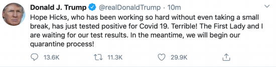 特朗普称,“一直以来努力工作毫不懈怠的霍普·希克斯刚刚新冠病毒检测呈阳性。非常糟糕!第一夫人和我目前正在等待我们的检测结果。与此同时,我们将开始我们的隔离程序”。