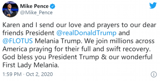 美国副总统彭斯刚刚在他的个人账号上发帖,表示他已向特朗普和梅拉尼娅夫妇发去慰问,祈祷他们早日康复。他写道:“我们和全美数百万人一道,为他们早日康复祈祷。愿上帝保佑你,特朗普总统和我们出色的第一夫人梅拉尼娅。”