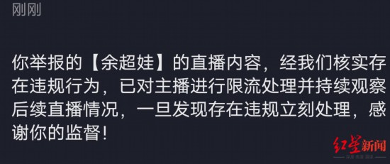 另外,还有一些网友对上述主播的行为进行了举报,据网友提供的一份平台回复显示:你举报的“余超娃”直播内容,经我们核实存在违规行为,已对主播进行限流并持续观察后续直播情况。一旦发现违规立即进行处理,感谢你的监督。
