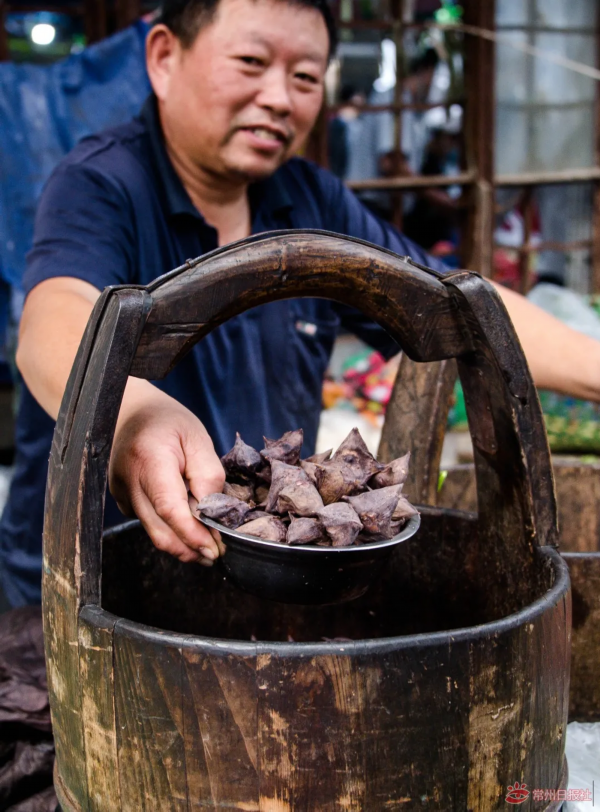 因为菜场上卖菱角的不多,所以时常有人询问,但也有不少被价格吓退的。“这样一盆菱角手工去壳要一个小时的,不好剥的。”之所以说不好剥,因为大叔卖得是四角乌菱。菱分四角和两角,以颜色区别又有红菱和乌菱。红菱要生吃,取其脆甜,不论如何烹饪,都保不住其水灵灵的清芳,只需握住两角轻轻一掰,就能看见水红外壳下一抹洁白的菱肉。乌菱要熟食,品其绵密。都说菱角“水中的栗子”,口感也是粉粉的,但没有栗子那般的坚果香气,多了些清透的甜。