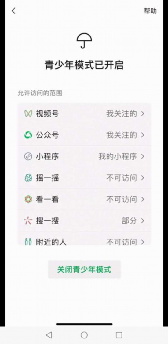 开启青少年模式后,使用微信小游戏、小程序、视频号、公众号、搜一搜等功能,会受到一些保护限制,家长也可根据情况设置允许访问的范围;摇一摇、看一看、附近的人等功能将不可访问。