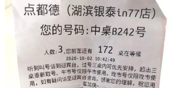 记者在现场看到,叫号屏上显示,前面已有123桌小桌(1-2人)、172桌中桌(3-4人)在等位。