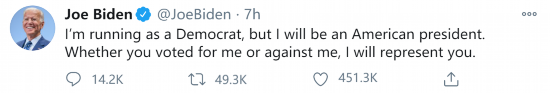 “(虽然)我现在是以民主党人的身份竞选,但我将成为美国总统。无论你们给我投的是赞成票还是反对票,我都将代表你们。”拜登在推特上写道。