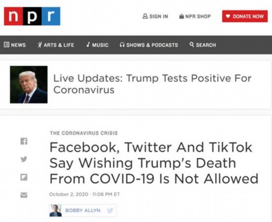 据NPR报道,自特朗普在2日发推称自己和妻子梅拉尼娅都感染了新冠肺炎后,社交媒体上充斥着各种猛烈攻击特朗普的内容,甚至有帖子希望“特朗普死掉”。