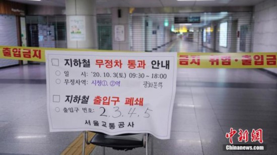 10月3日,韩国多个民间团体发起“免下车”集会,首尔调动大批警力严防疫情,多个地铁站关闭。图为市厅站地铁站外贴有“此站不停车”等通知。 中新社记者 曾鼐 摄
