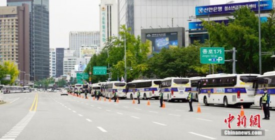 记者在首尔市中心看到,大批警力将光化门广场附近围得“水泄不通”;从市厅到光化门,数公里路段有数百辆警车停靠,行人道上设有诸多栅栏,禁止随意出入,市厅站等多个地铁站关闭。警方全部戴有面罩和口罩。