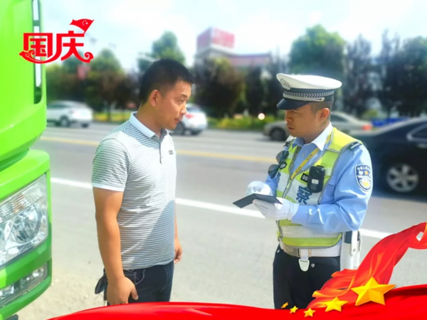 为保障节日道路交通安全,交警中队民警加强路面管控,对来往的大型货运车辆进行安全检查。