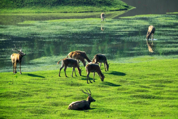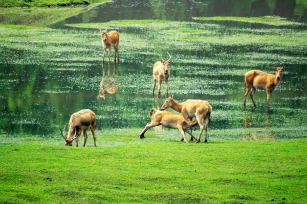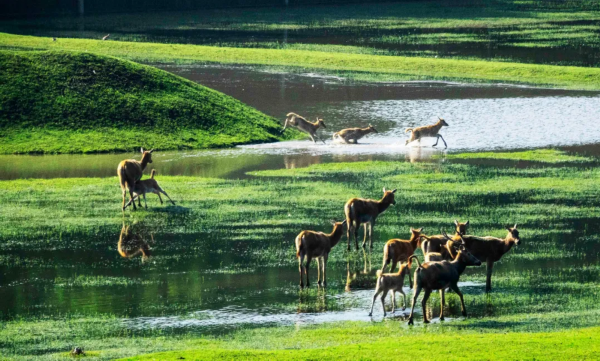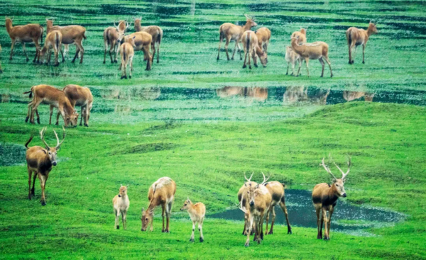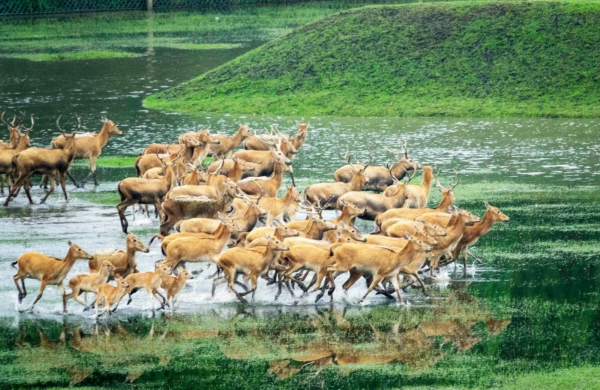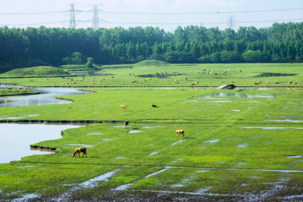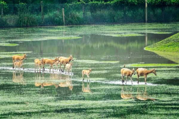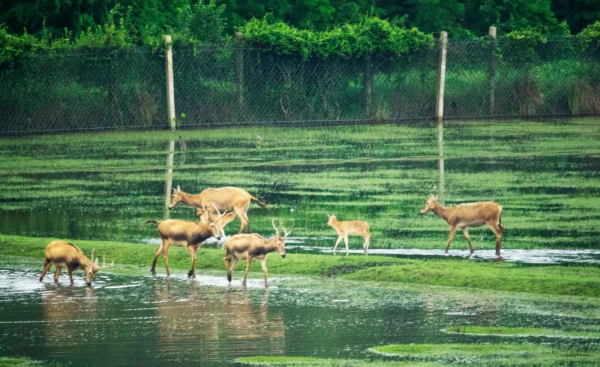 上世纪90年代,溱湖湿地保护区引进四头麋鹿实行保护放养,使得这一珍稀动物在故乡重新繁衍生息。