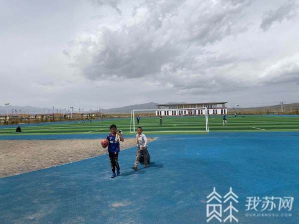 在兴海县安多村异地搬迁点,可以看到,大片的平层别墅整齐洁净,绿茵足球场在群山环抱当中,显得分外开阔。牧民的孩子们正在球场上奔跑踢球,欢声笑语响彻高原。