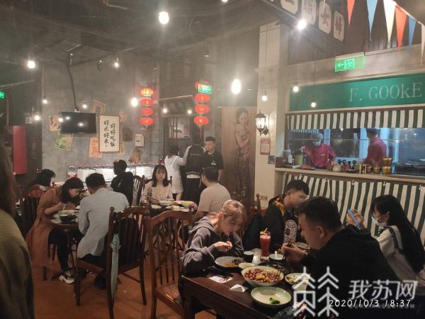 今天(10月3日)中午12点半,南京新百8楼美食广场人头攒动,几乎每家餐饮店外都坐满了排队等候的顾客,店内更是熙熙攘攘座无虚席。记者看到,用餐的人们或光盘、或打包,桌上几乎没有什么剩菜剩饭。