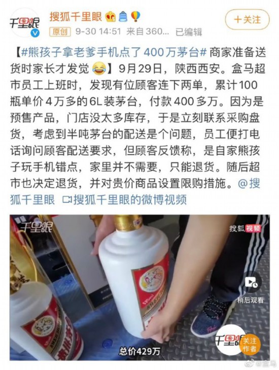 据盒马官方微博发布的“搜狐千里眼”报道显示,9月29日,陕西西安盒马超市员工上班时,发现有位顾客连下两单,累计100瓶单价4万多的6L装茅台,付款400多万。因为是预售产品,门店没太多库存,于是立刻联系采购盘货,考虑到半吨茅台的配送是个问题,员工便打电话询问顾客配送要求,但顾客反馈称,是自家熊孩子玩手机错点,家里并不需要,只能退货。随后超市也决定退货,并称将对单价较贵商品设置限购措施。