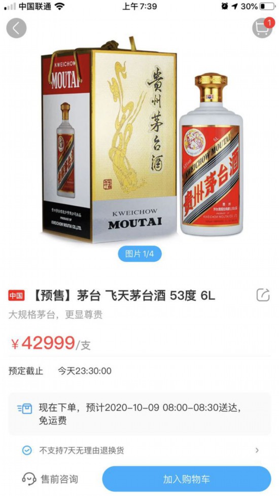 中国经济网记者登录盒马app发现,其销售的单价4万多的茅台仅有一款,即6L装53度飞天茅台酒,每瓶售价42999元。