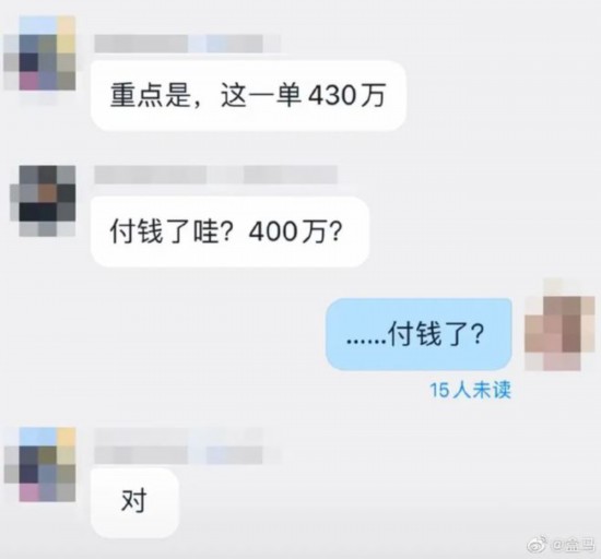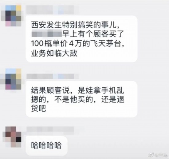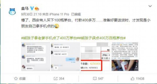 9月30日,盒马官方微博发布消息称,“懵了,西安有人买下100瓶茅台,付款400多万,准备好要送货时,才发现是小朋友自己拿手机点的。”