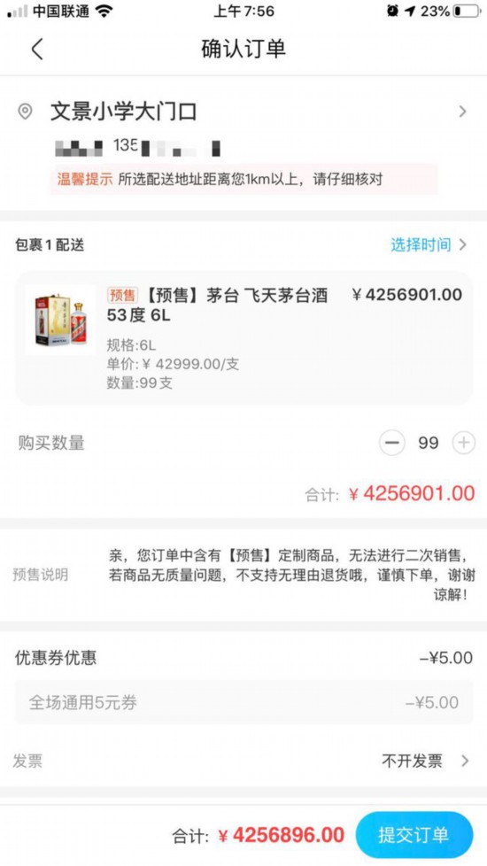 但据记者验证,西安盒马超市目前仍未对6L装53度飞天茅台酒设置限购。在盒马app上,记者将送货地址填写为西安市某小学大门口,发现其所售6L装53度飞天茅台酒为预售产品,单次最多可购买99瓶,商品总价为425.69万元。