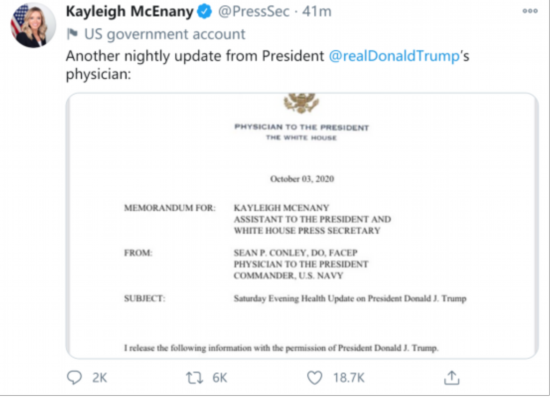 此外,当地时间3日晚,白宫新闻秘书麦克纳尼在推特上再次更新了一份康利有关特朗普情况的声明。声明表示,特朗普的情况“依然很好”,其治疗也取得了“实质性进展”。特朗普在当晚接受了第二阶段瑞德西韦的治疗,没有出现发热症状及并发症。