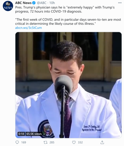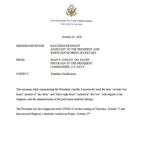 “今天早上在总结总统健康状况时,提及他的确诊(时间)和多克隆抗体治疗时,我错误地使用了‘72小时’的说法来替代‘(确诊)第3天’,‘48小时’来替代‘第2天’。”康利在声明中明确说,“总统于周四晚,10月1日首次确诊感染新冠,并于周五,10月2日接受了抗体鸡尾酒疗法。”