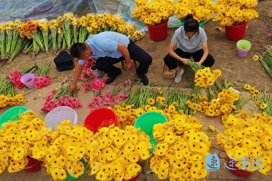 10月2日,在泗洪县界集镇后钟洼村非洲菊种植基地,工人在采收、分拣、包装非洲菊,一派繁忙。