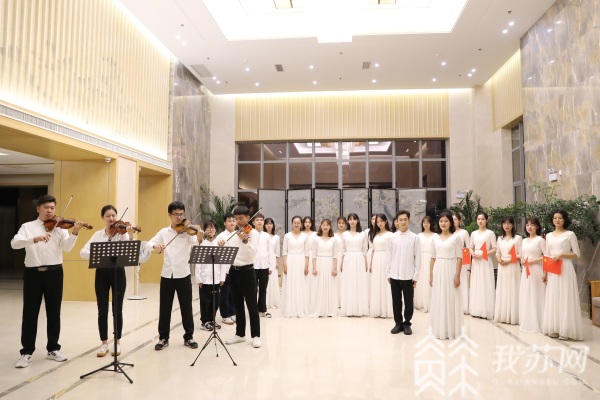 “我和我的祖国,一刻也不能分割,无论我走到哪里,都流出一首赞歌……”值得注意的是,此次灯光秀活动中还加入了合唱的环节。现场,近30名江苏大学合唱团、弦乐团的学生以一首《我和我的祖国》为活动开场。