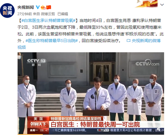 当地时间4日,白宫医生肖恩·康利承认特朗普于2日、3日两次血氧饱和度下降,最低降至93%左右,曾因此吸氧和使用地塞米松。此前,该医生曾坚称特朗普未曾吸氧,他说这是想传递“积极乐观的态度”。此外,#医生称特朗普最早5日出院#,回白宫接受后续治疗。
