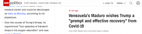【环球网快讯】据CNN最新消息,当地时间4日,委内瑞拉总统马杜罗在一场向全国发表的电视讲话中,祝福已感染新冠病毒的美国总统特朗普“早日康复”。
