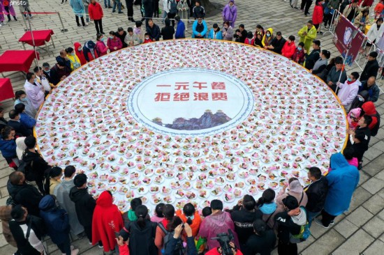 在现场设有就餐桌,每张桌子上都有“珍惜粮食,拒绝浪费”的提醒标牌,提醒人们不要浪费。