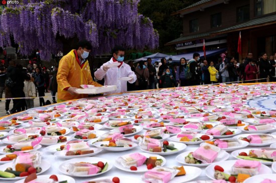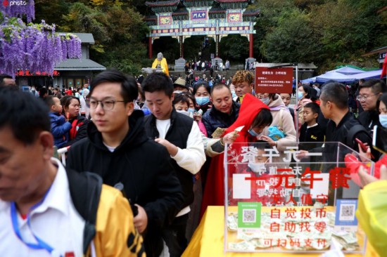 2020年10月4日,河南洛阳,无人值守一元午餐在老君山景区持续上岗,从今年的国庆长假开始,已持续四天,也是该景区国庆假期持续推行一元午餐的第四年,在现场大家一起宣誓“珍惜粮食,拒绝浪费”,工作人员引导游客保持距离,分时放行,有序就餐。(图片来源:东方IC)