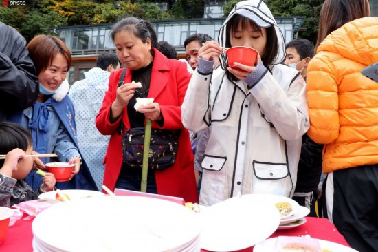 在食物配置上,今年主食依然是当地特色的玉米糊涂面,并配有装着黄瓜段、圣女果、两个鹌鹑蛋的果盘,因为今年国庆假期恰逢中秋,景区特地又另外增加了一块月饼。并设置了大小份,馒头分大小馒头、主食面条也有一份和半份之分,避免浪费。