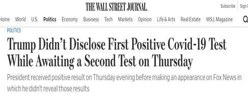 《华尔街日报》称,特朗普在1日晚上已通过快速检测得到了首个阳性结果。随后,他与福克斯新闻的一档节目进行了电话连线。然而,节目期间,他并未透露自己的这一检测结果。
