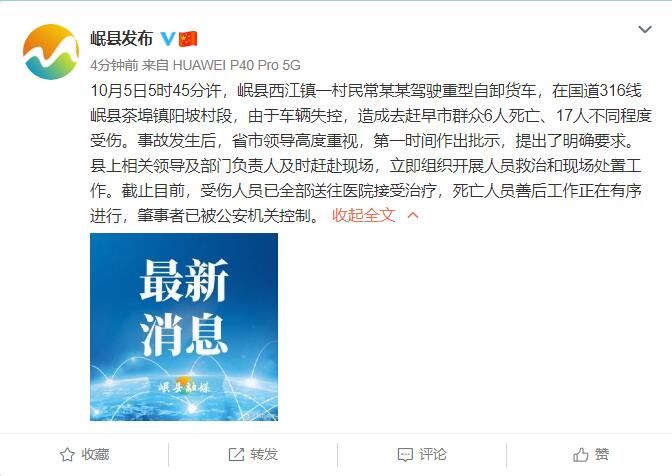 荔枝新闻讯 据甘肃省定西市岷县政府新闻办官方微博“岷县发布”消息,10月5日5时45分许,岷县西江镇一村民常某某驾驶重型自卸货车,在国道316线岷县茶埠镇阳坡村段,由于车辆失控,造成去赶早市群众6人死亡、17人不同程度受伤。事故发生后,省市领导高度重视,第一时间作出批示,提出了明确要求。县上相关领导及部门负责人及时赶赴现场,立即组织开展人员救治和现场处置工作。截止目前,受伤人员已全部送往医院接受治疗,死亡人员善后工作正在有序进行,肇事者已被公安机关控制。