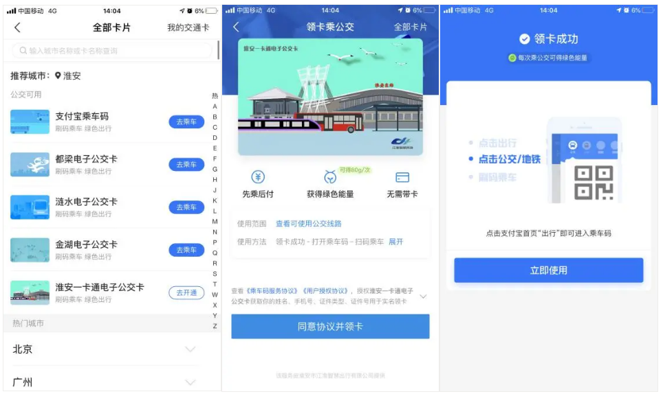 打开支付宝首页,点击【卡包】——选择交通卡再点击【查看全部】——选择淮安地区【淮安一卡通电子公交卡】——【去开通】