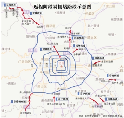 具体道路方面,京藏、京开、京新、京承、京港澳车流量较大,预计京藏高速康庄、居庸关、西三旗、北沙滩,京承高速黄港、太阳宫,京港澳高速琉璃河、西道口,京开高速玉泉营、新发地、榆垡等路段以及各进京主收费站都是车多的点段。此外,北京站、北京西站、北京南站、首都机场、大兴机场也将迎来返程客流高峰。