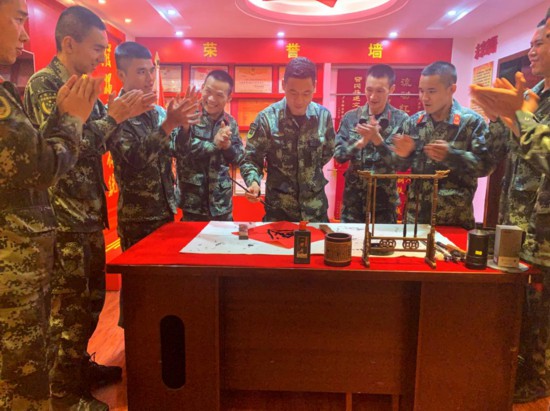 韶关中队何小龙指导员与战士共同开展学习书法活动 李位航摄