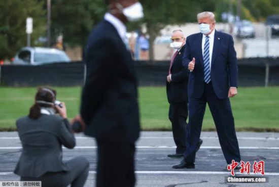 当地时间10月5日,美国总统特朗普离开位于马里兰州的国家军事医疗中心返回华盛顿,在华盛顿沃尔特里德医疗中心接受新冠肺炎治疗后,抵达白宫时摘下口罩。