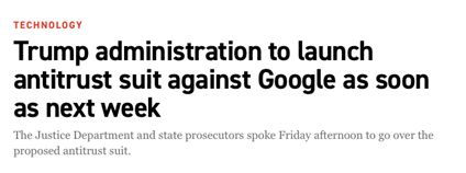近日,据外媒报道,特朗普政府最快将于本周将对谷歌提起反垄断诉讼,这标志着华盛顿与硅谷巨头的斗争开始升级。