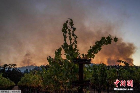 当地时间10月3日,美国北加州葡萄酒乡的“玻璃大火”持续肆虐,当地出动直升机协助灭火。图为从附近葡萄酒园眺望山火,浓烟滚滚冲天际。